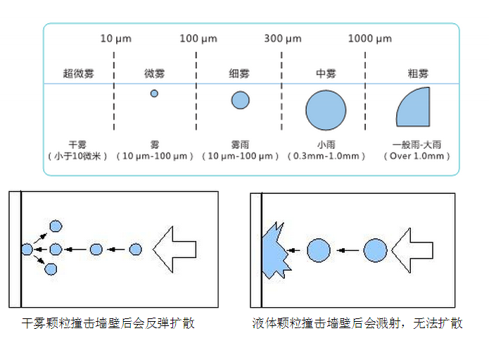 當(dāng)液滴的平均直徑小于10微米時,噴出霧可以被稱作是“干”的;小的液滴會從墻面上彈開并且不會破裂附著使表面潮濕。而所有的條件的建立都是為了滿足殺孢子劑以氣化的形式有效地移動到指定的區(qū)域,這種形式的特性決定了它們可以移動到平時難以達到的區(qū)域。